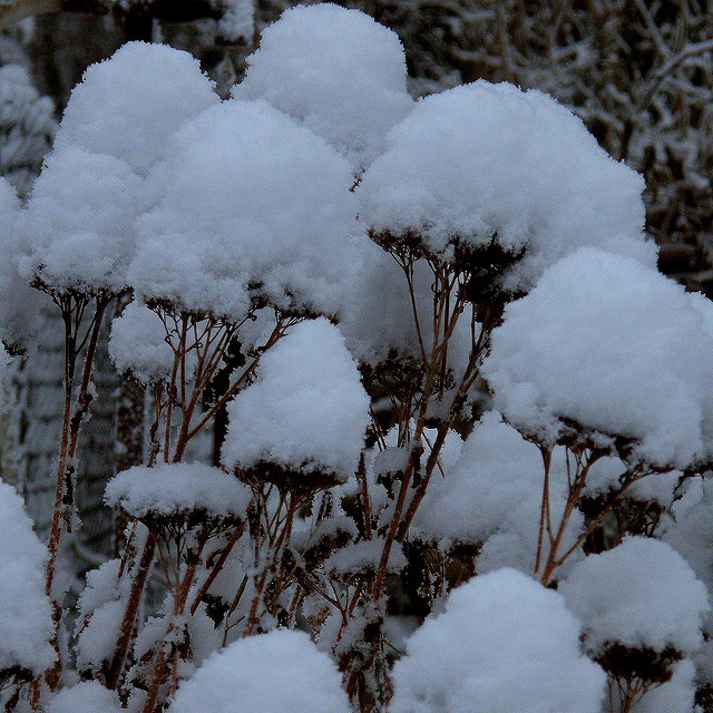 Sedum: While sedum lose their foliage in the fall and can look rather gangly, the remaining blooms are snow-collecting platforms that turn to billowy, pillowy snow puffs in the winter. If you just can’t stand the look of sedum sticks in the fall, go ahead and cut them to the ground once the flowers die.